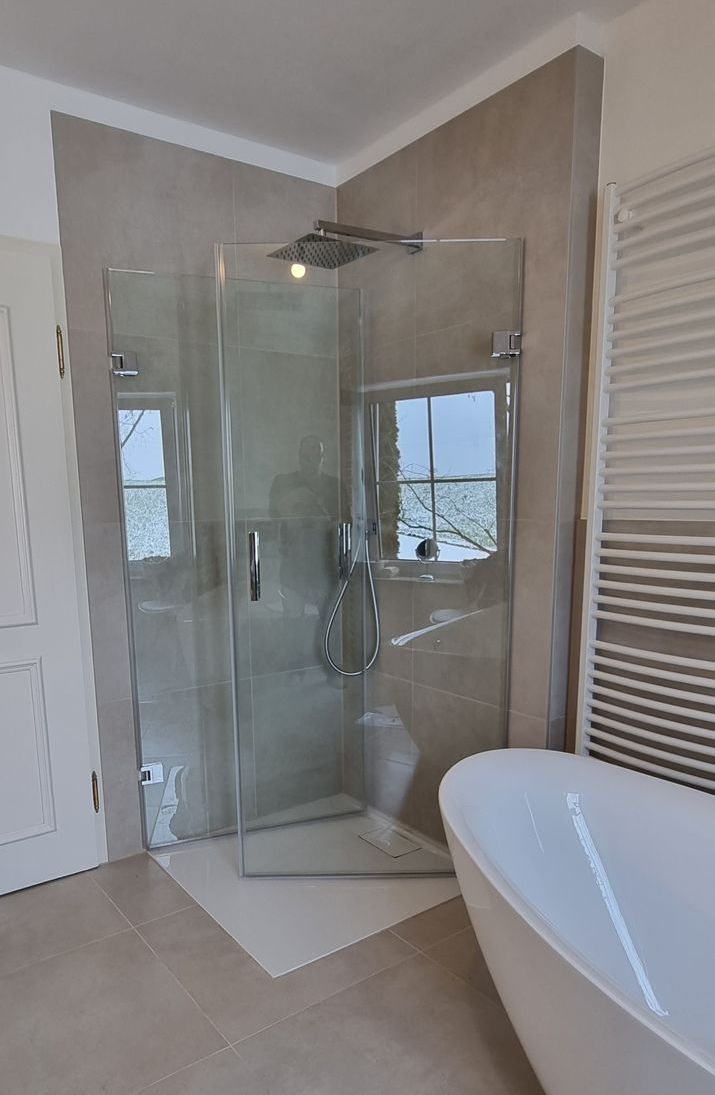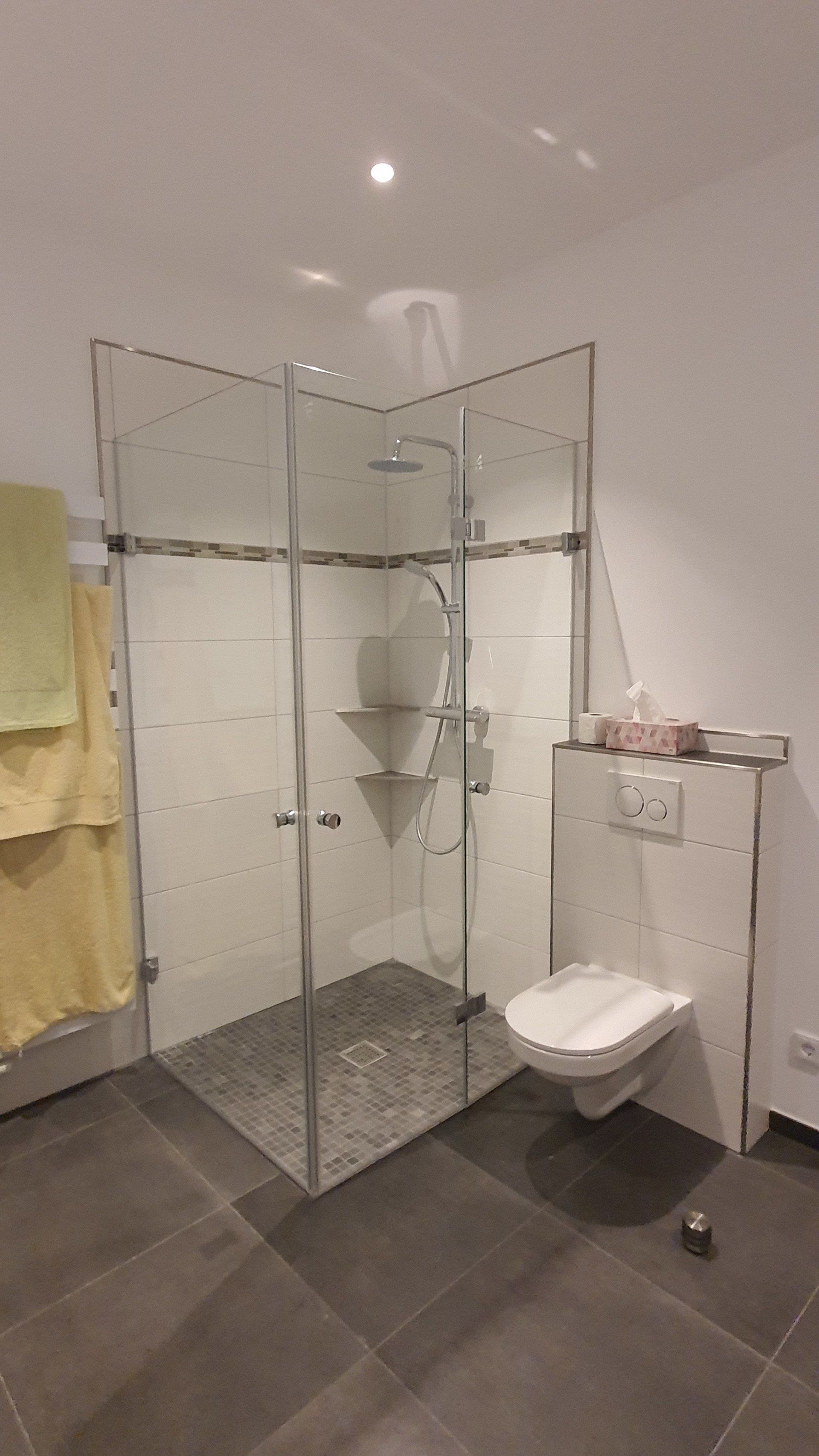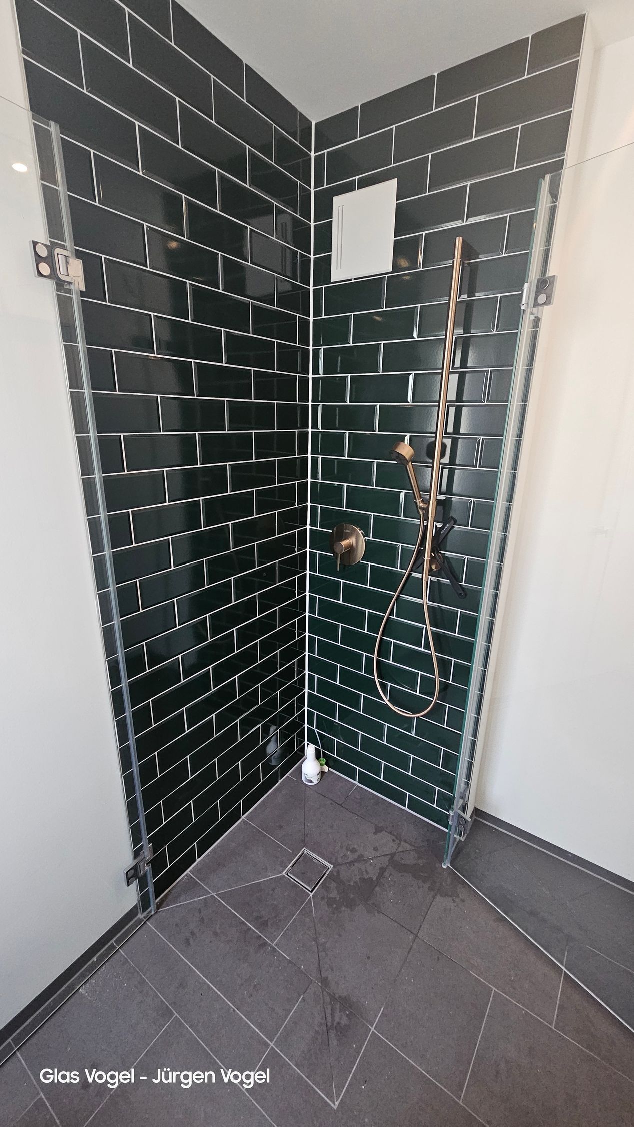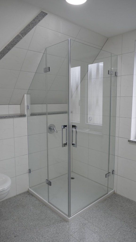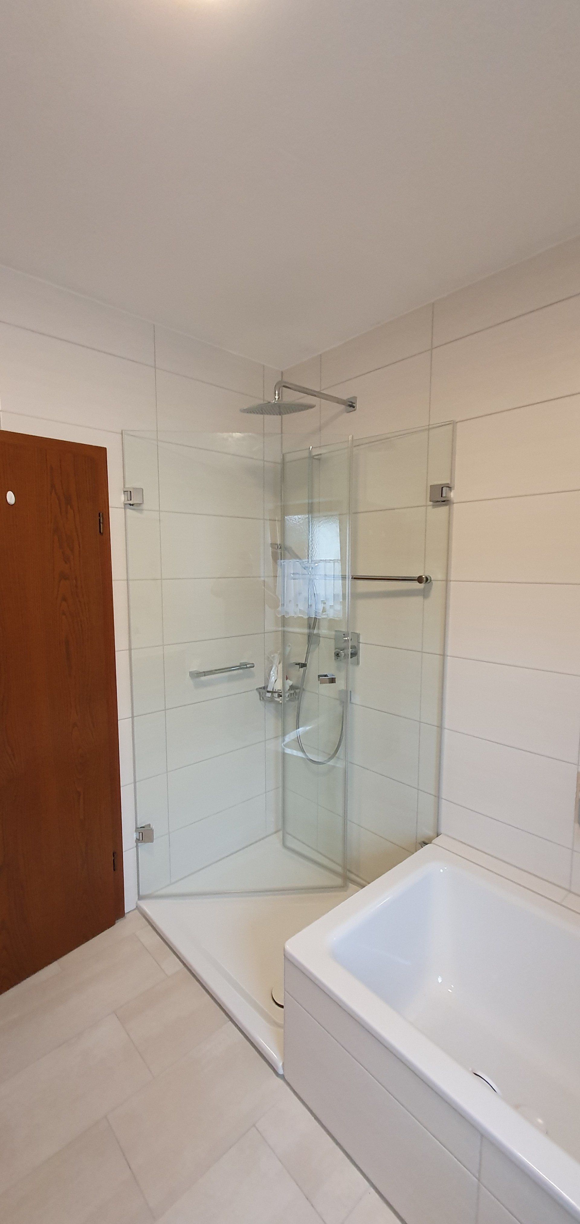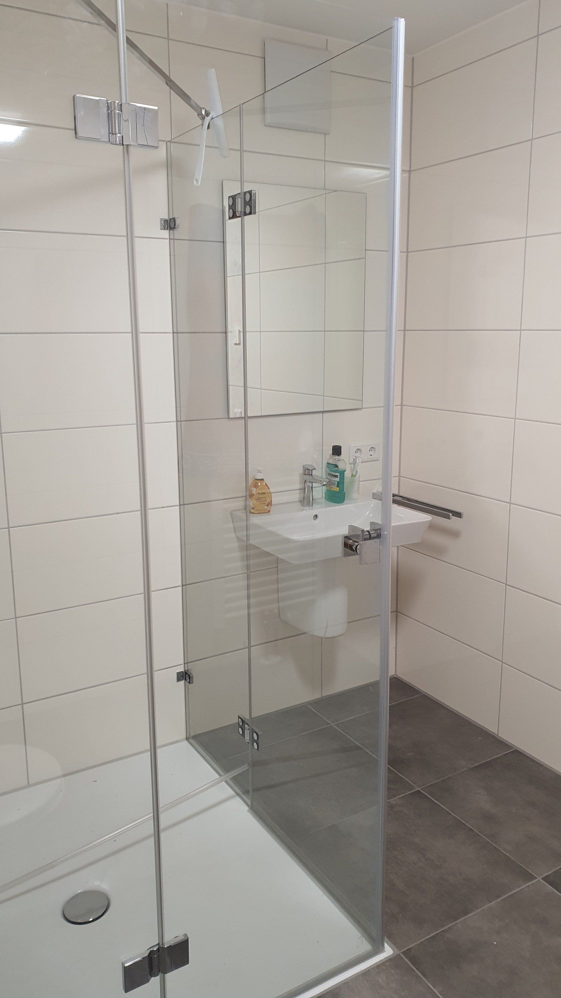 Ganzglasduschen ggf. mit Pendeltüren, die sich nach innen und nach außen öffnen lassen.