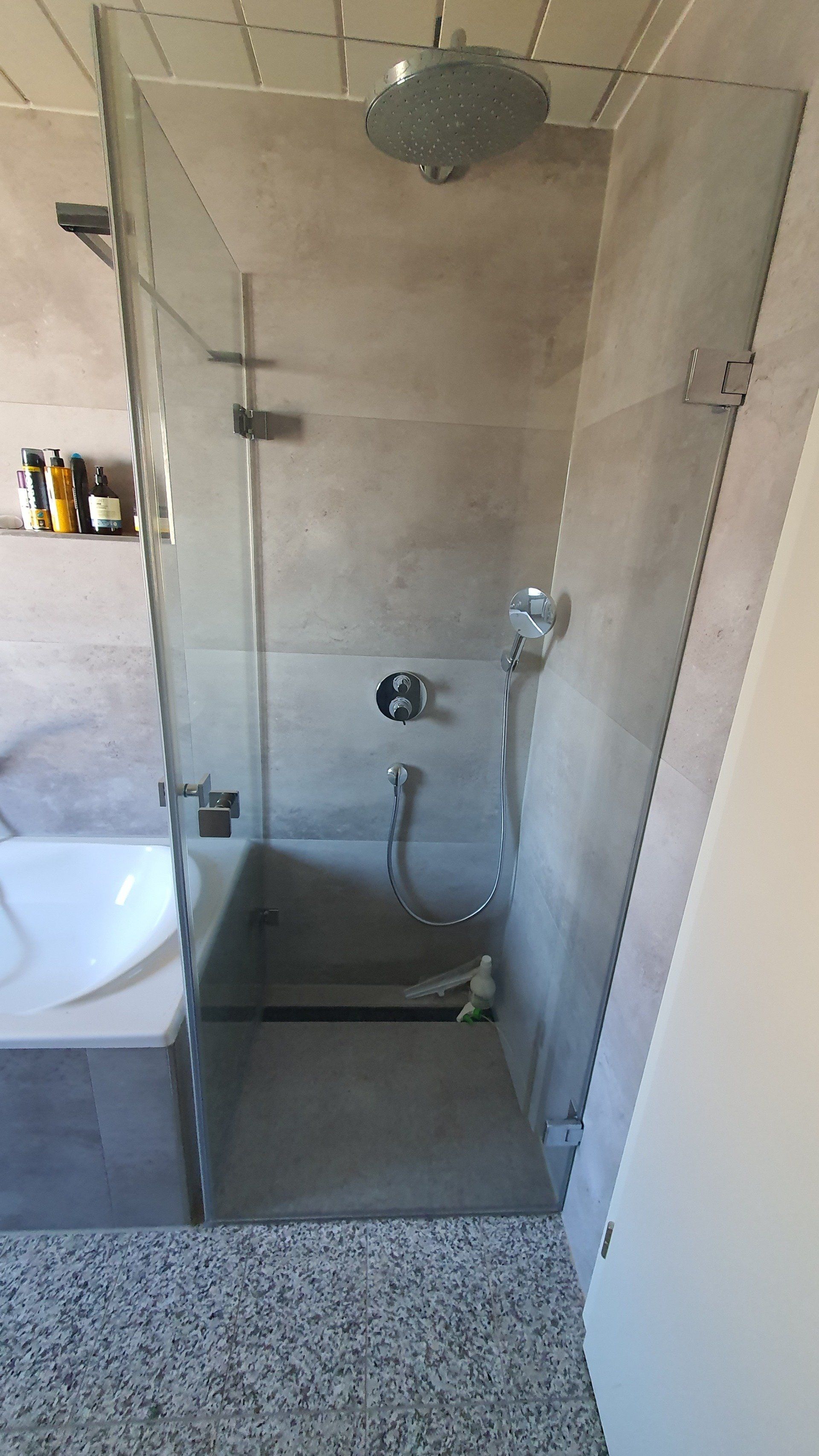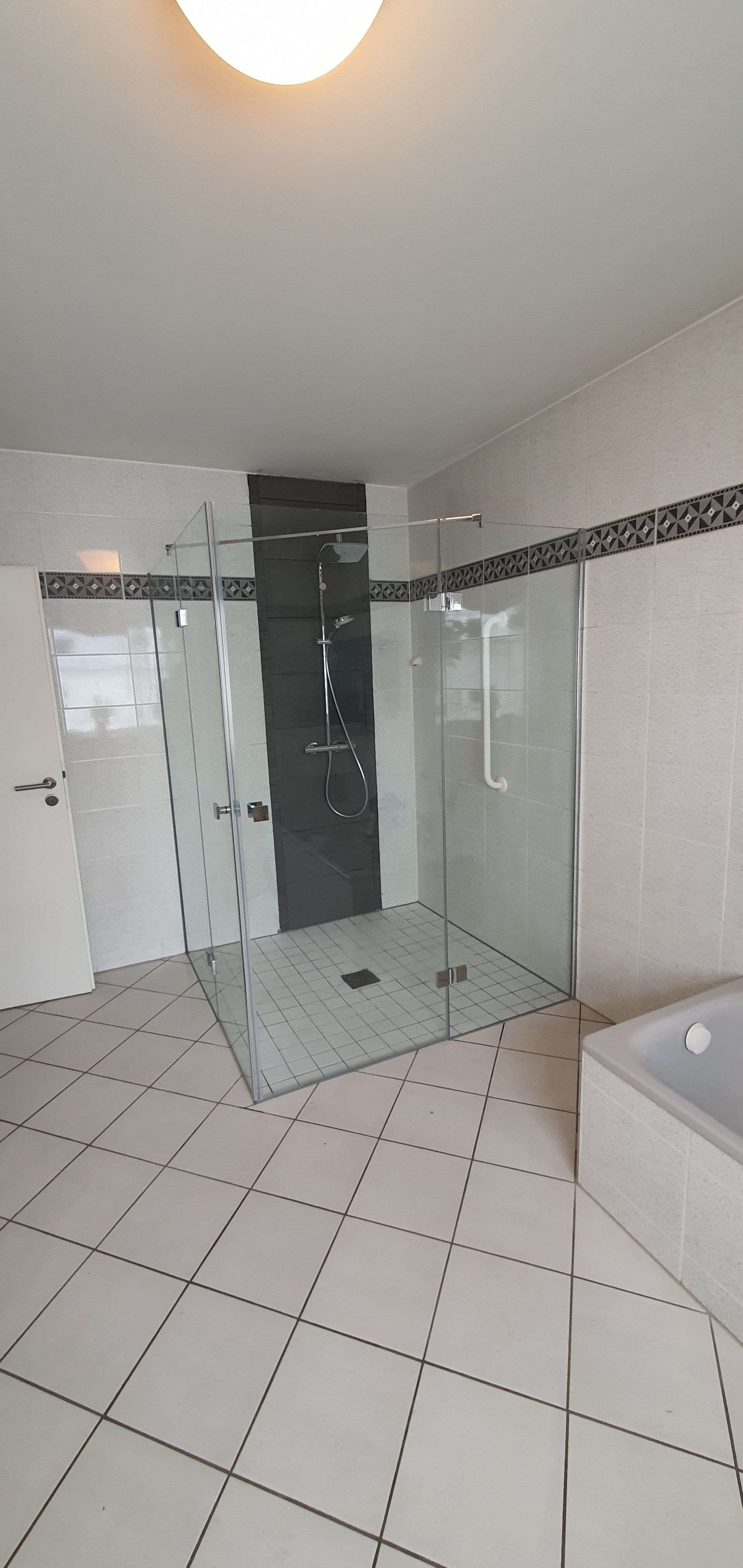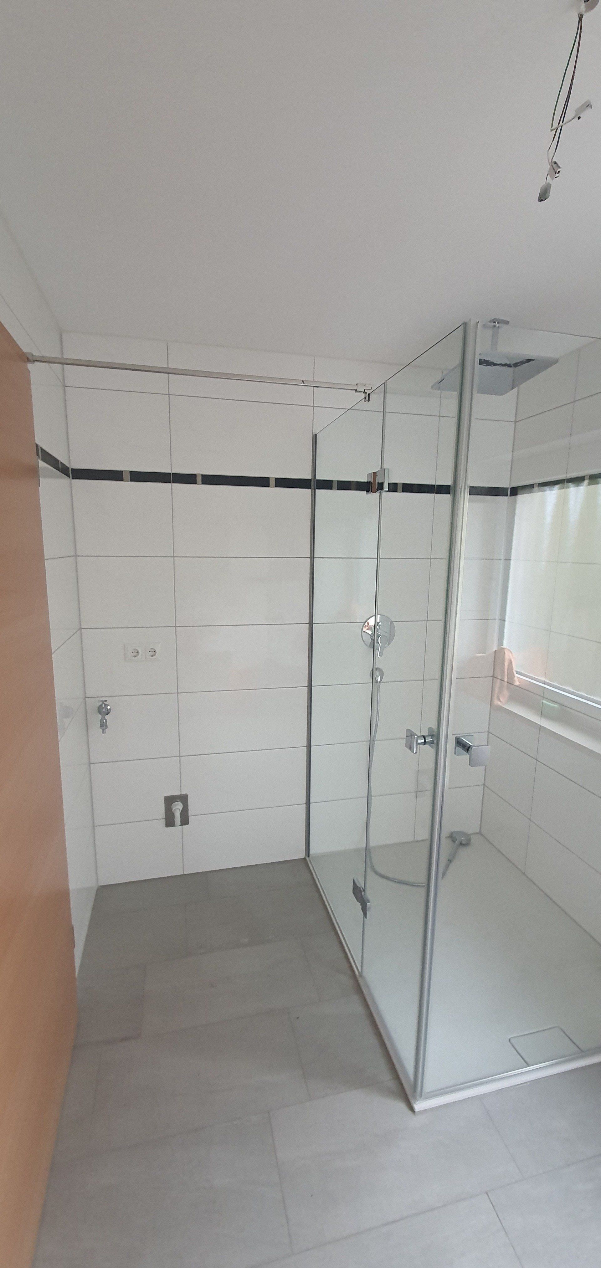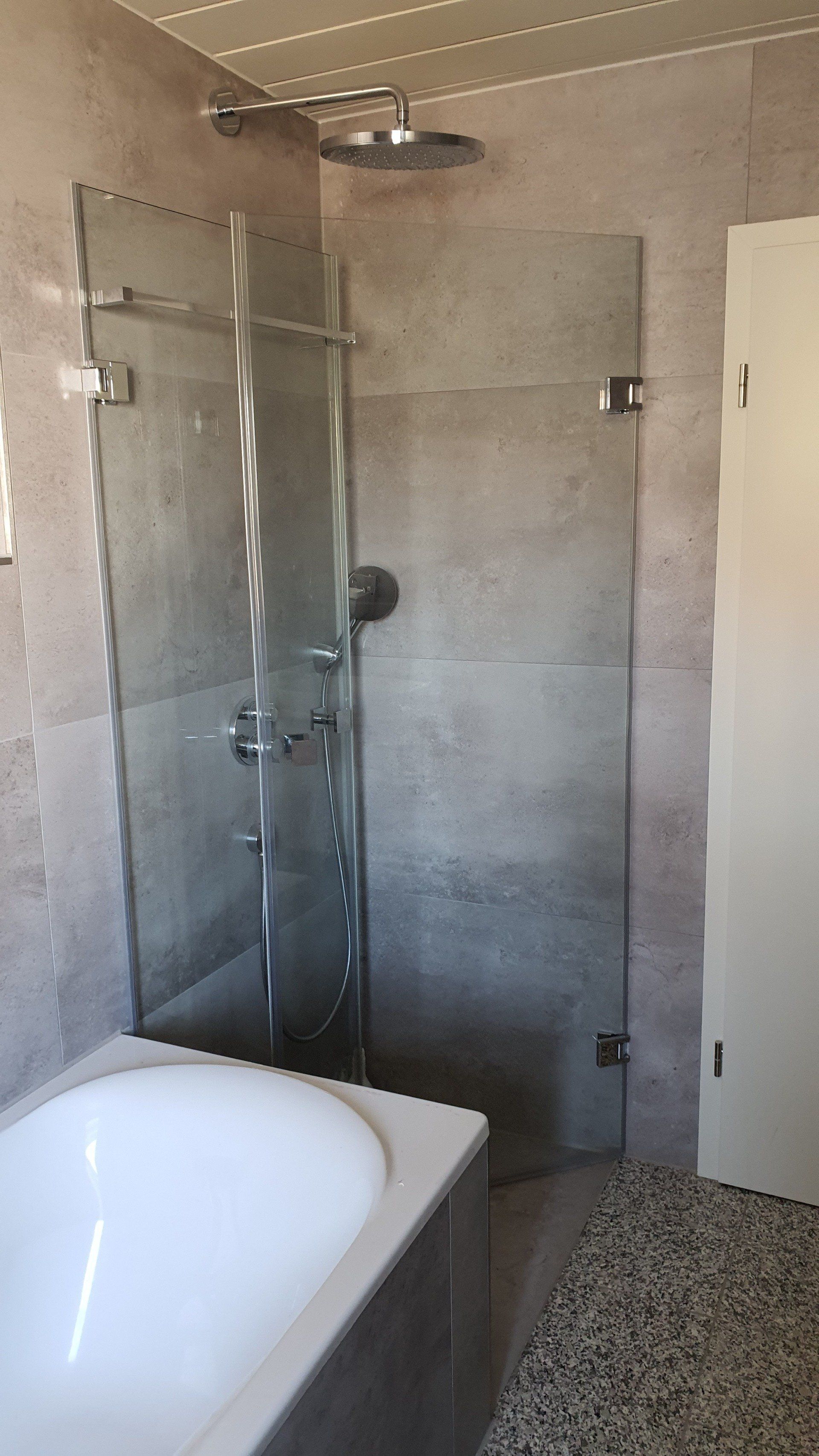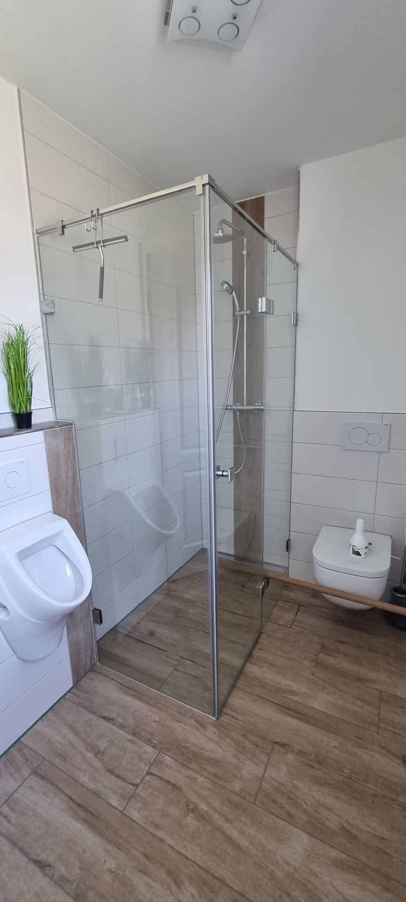 Ganzglasduschen ggf. mit Pendeltüren, die sich nach innen und nach außen öffnen lassen.