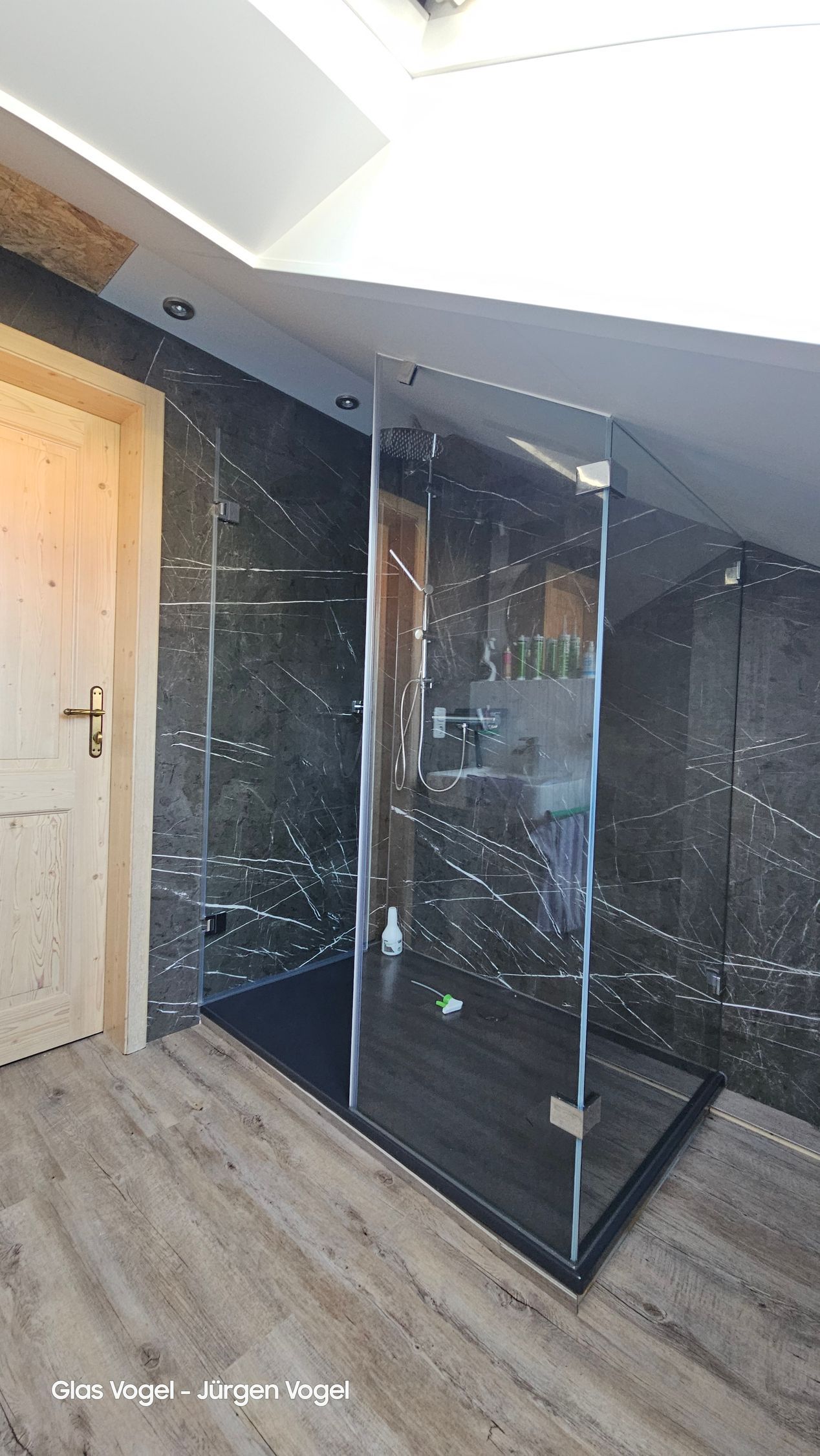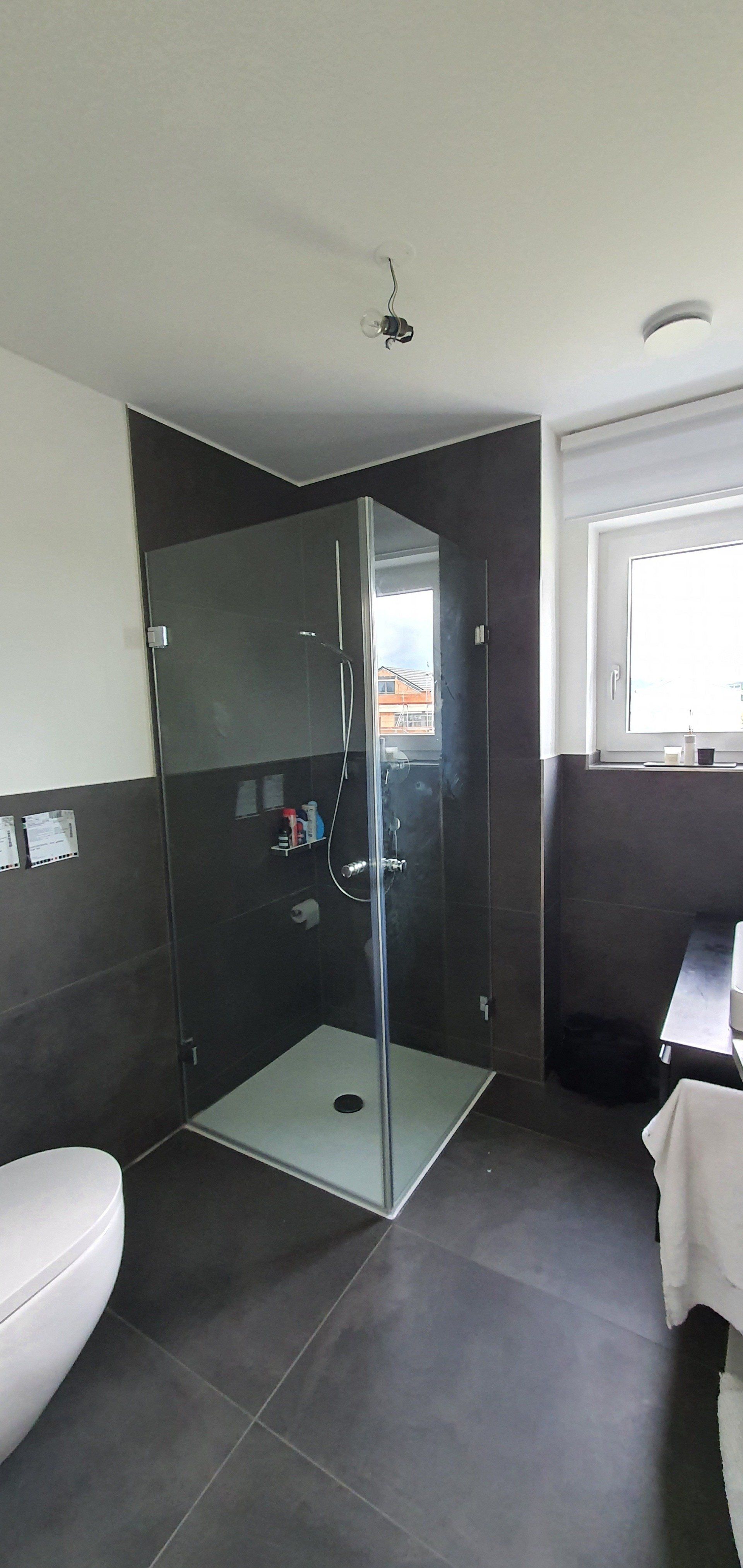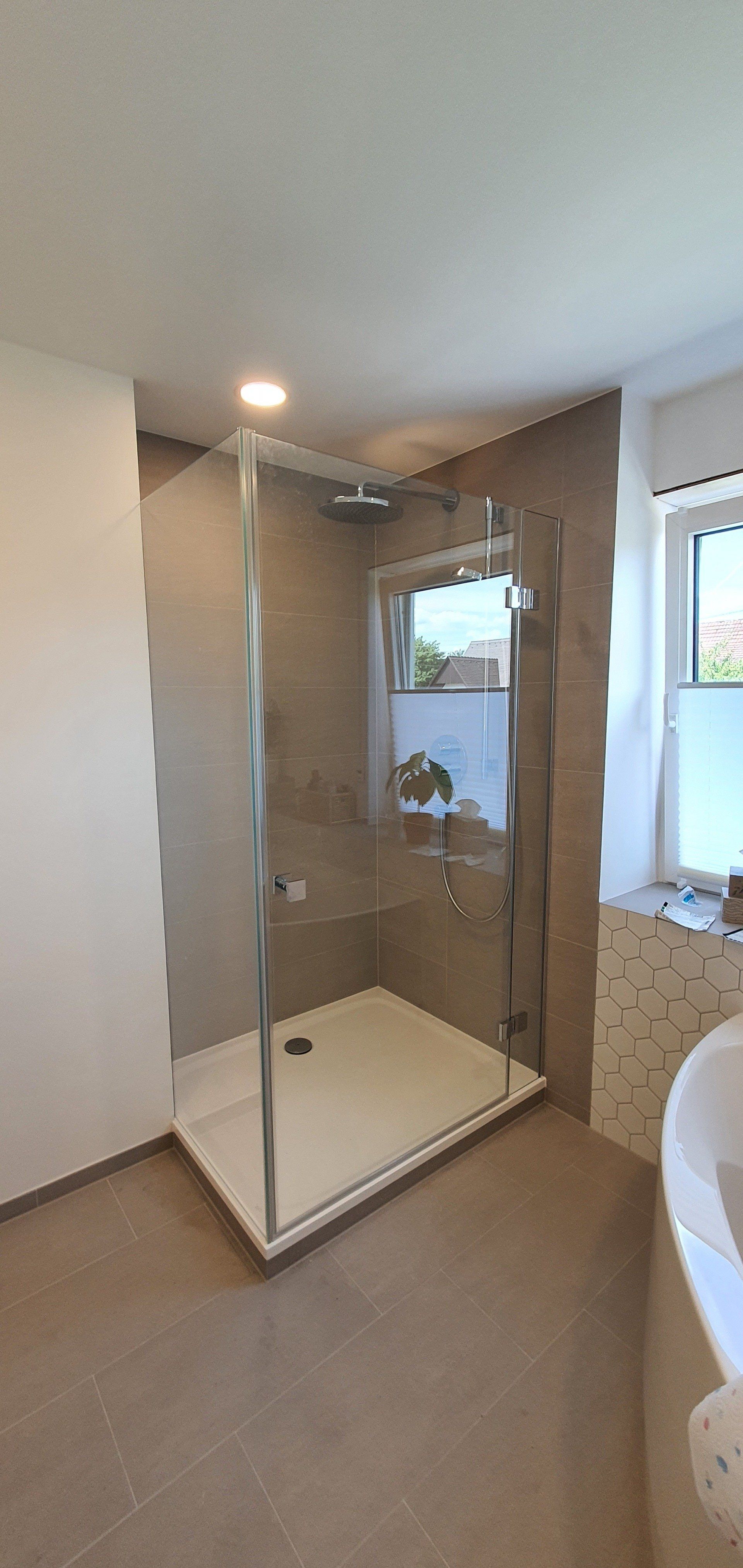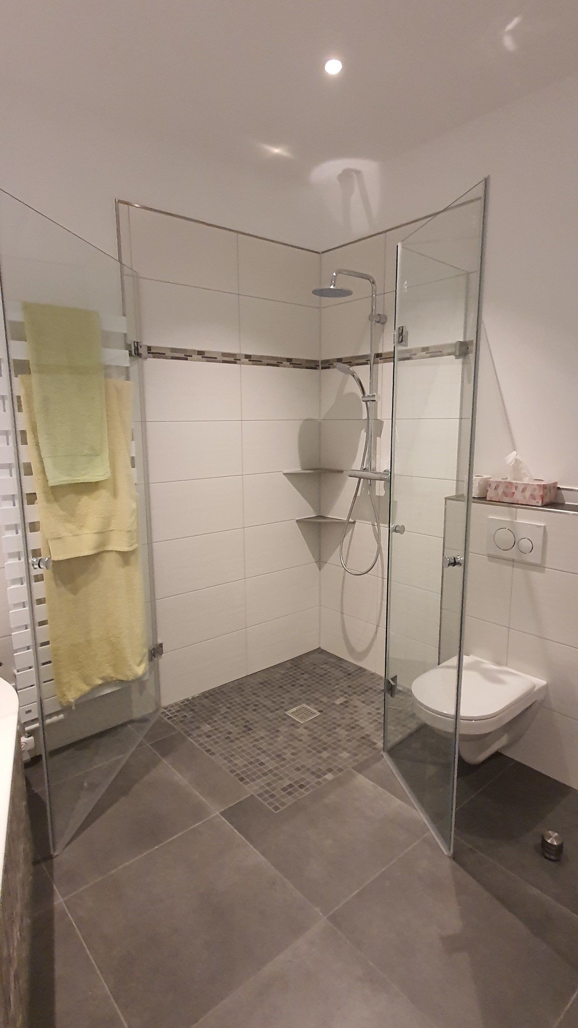 Ganzglasduschen ggf. mit Pendeltüren, die sich nach innen und nach außen öffnen lassen.