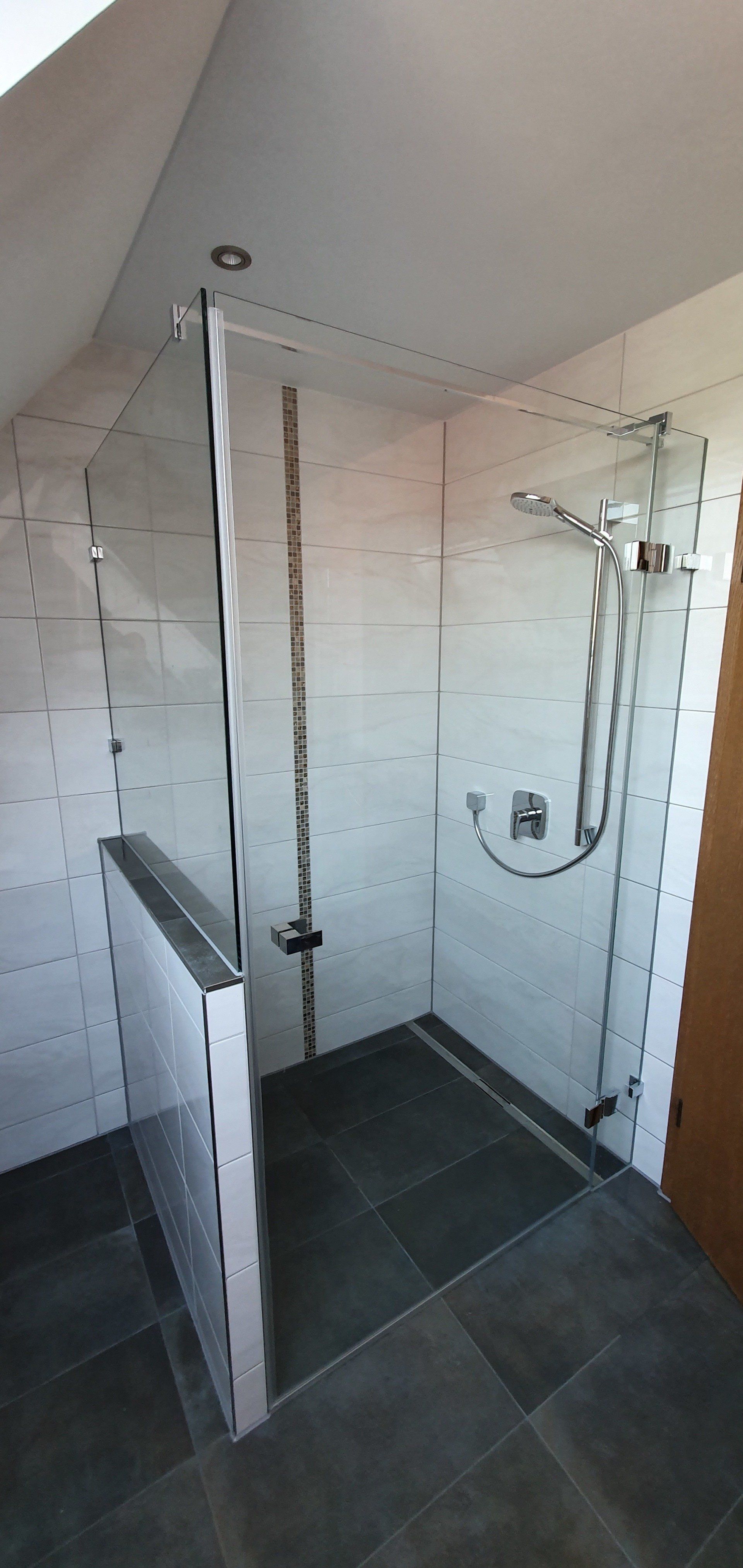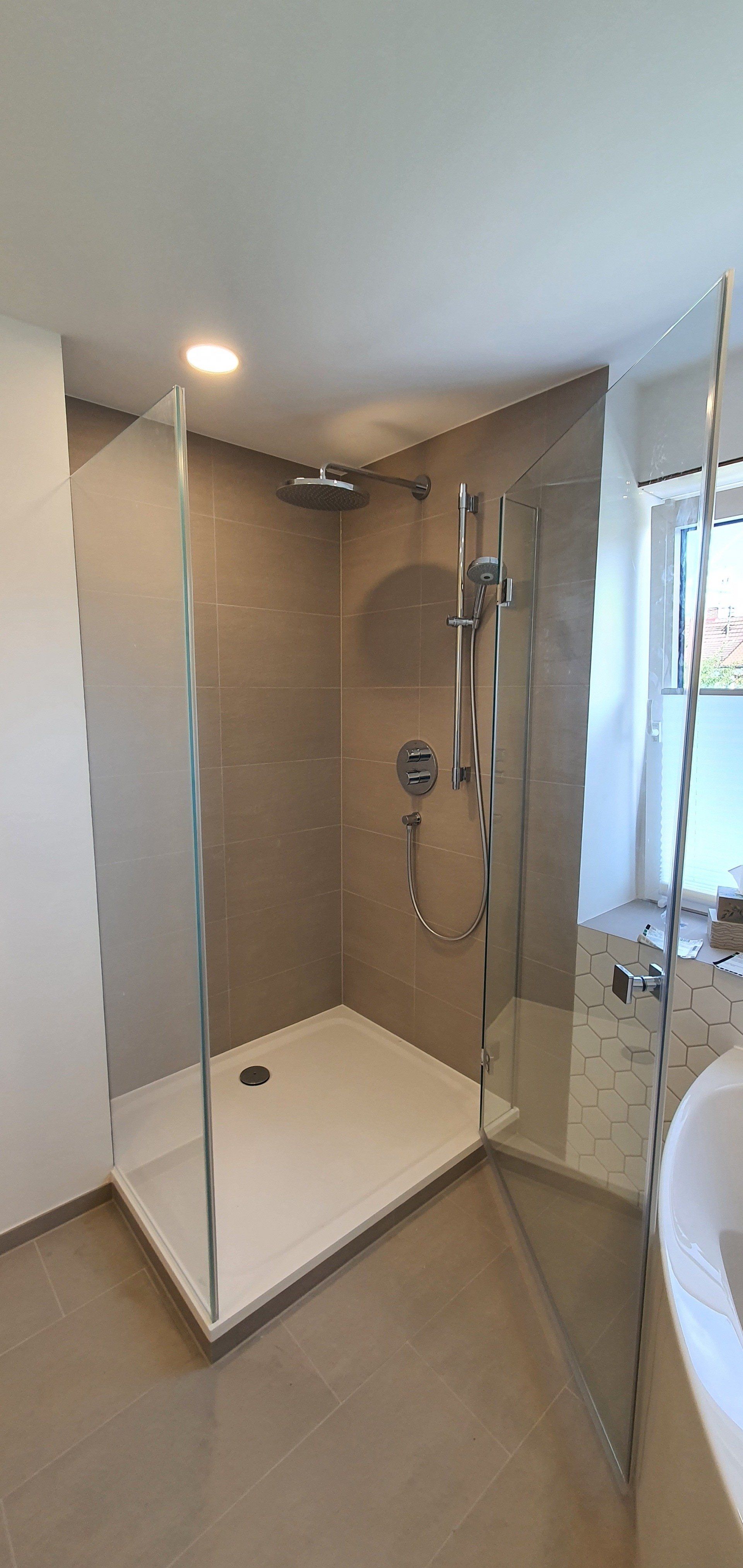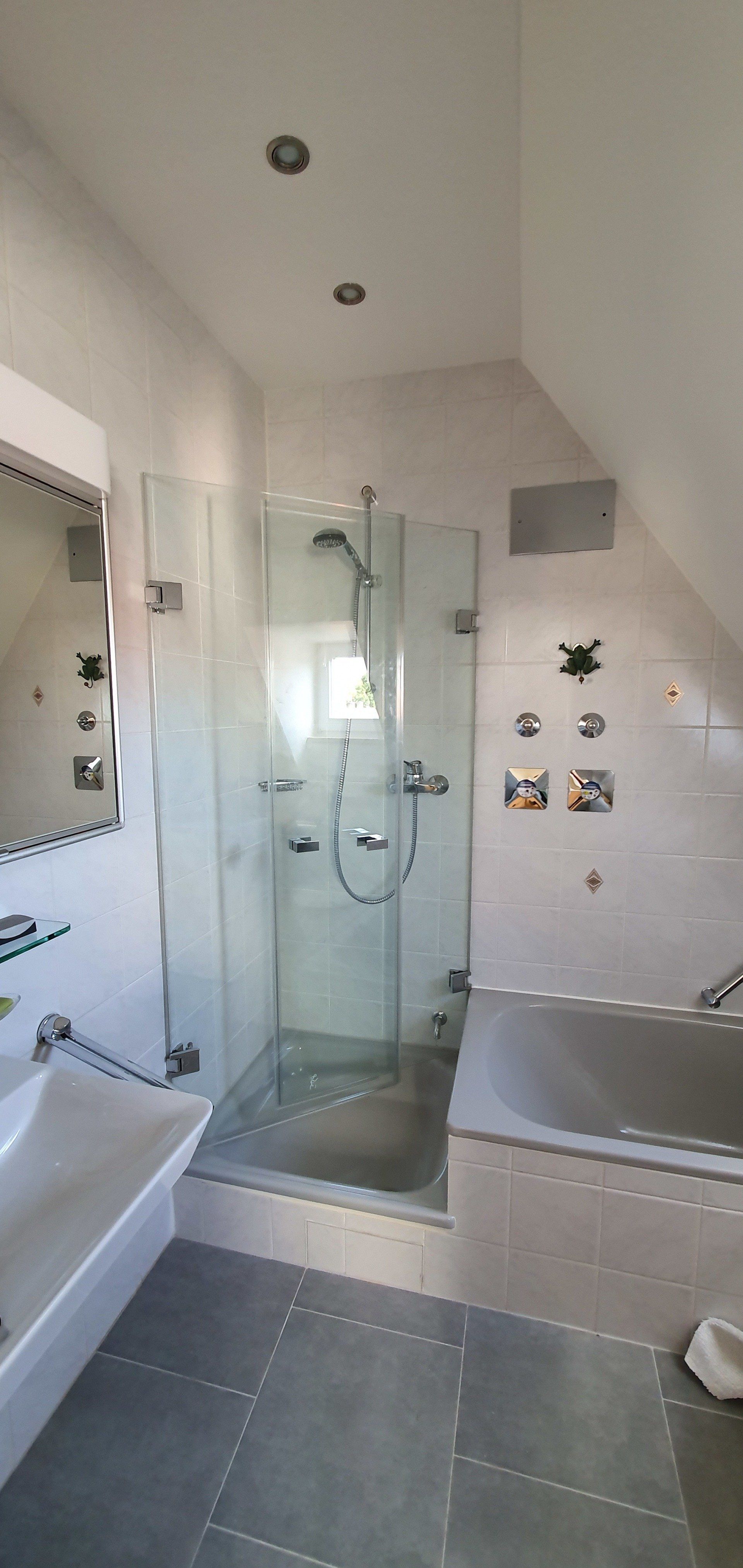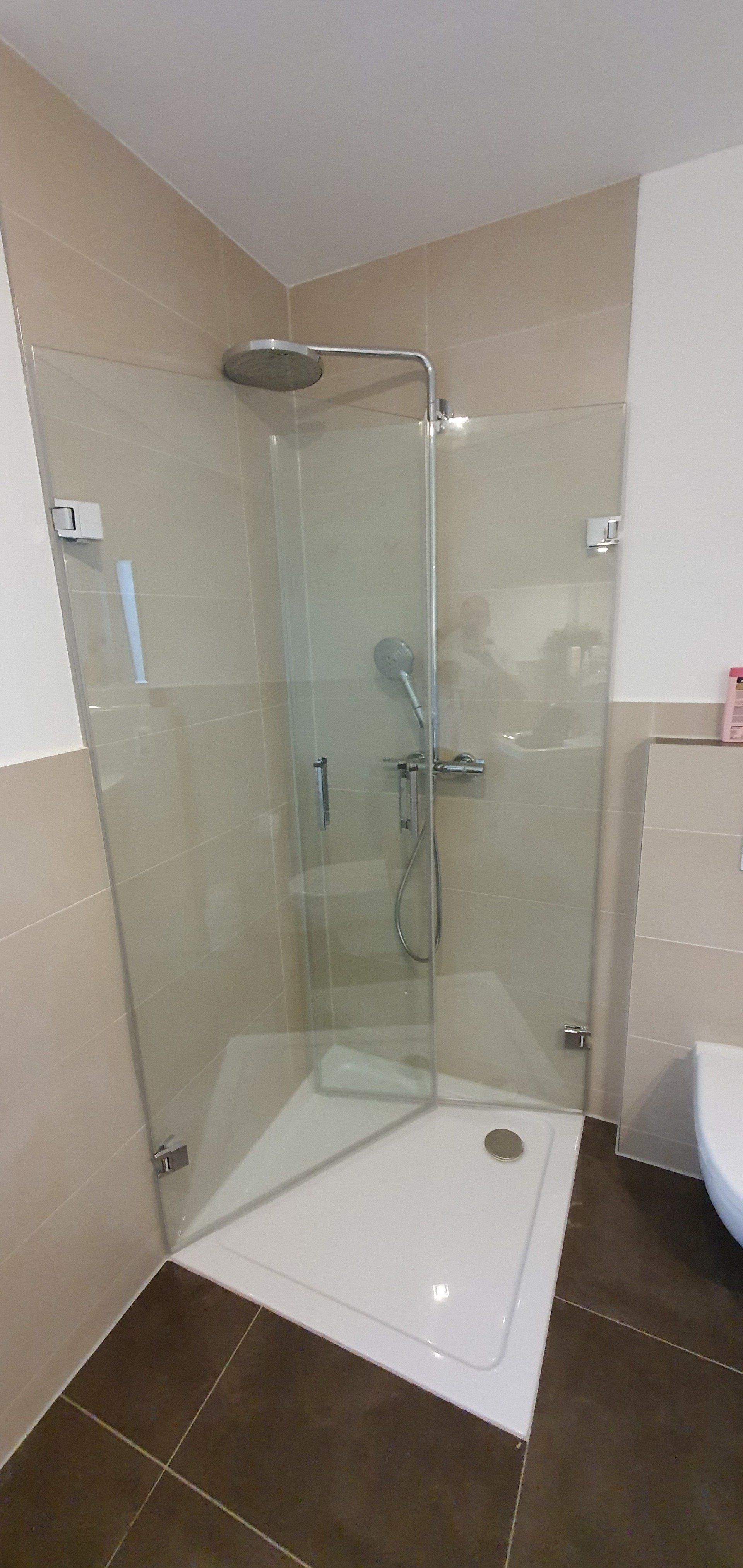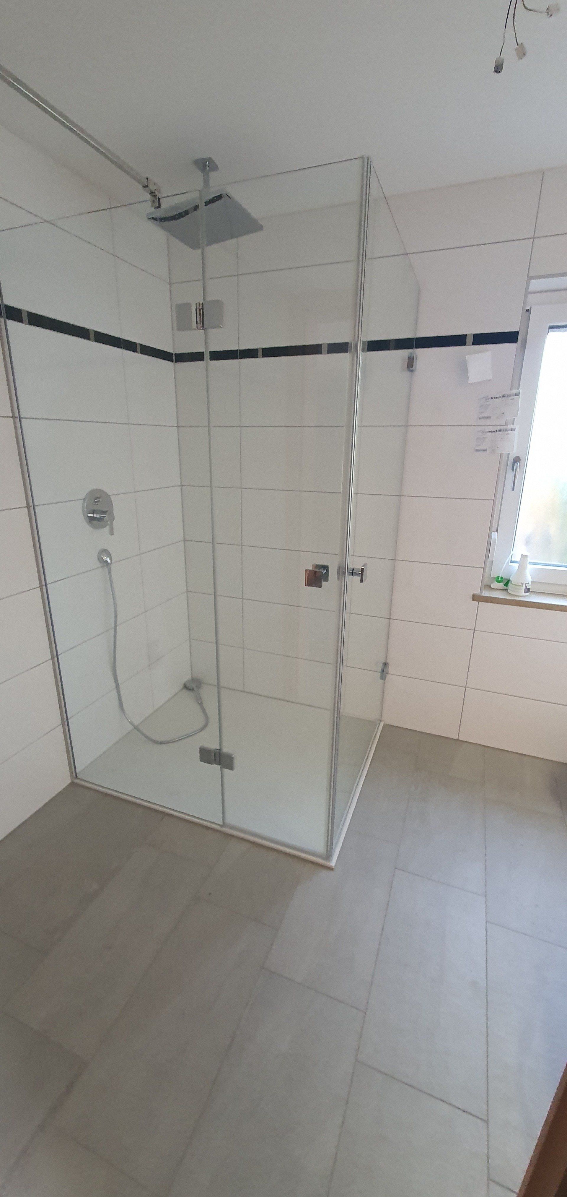 Ganzglasduschen ggf. mit Pendeltüren, die sich nach innen und nach außen öffnen lassen.