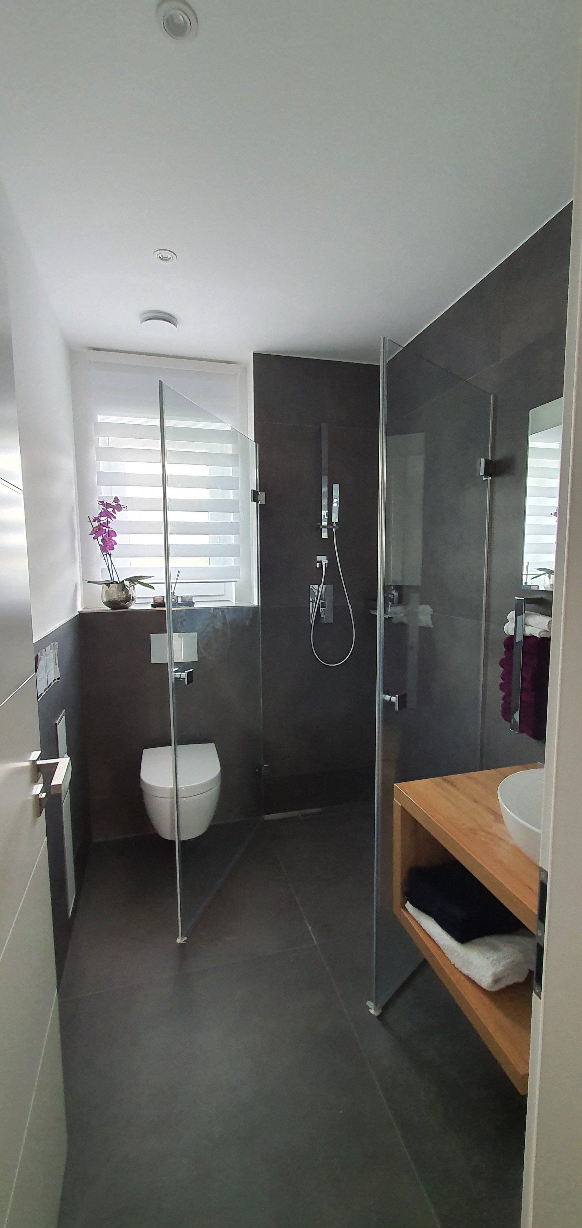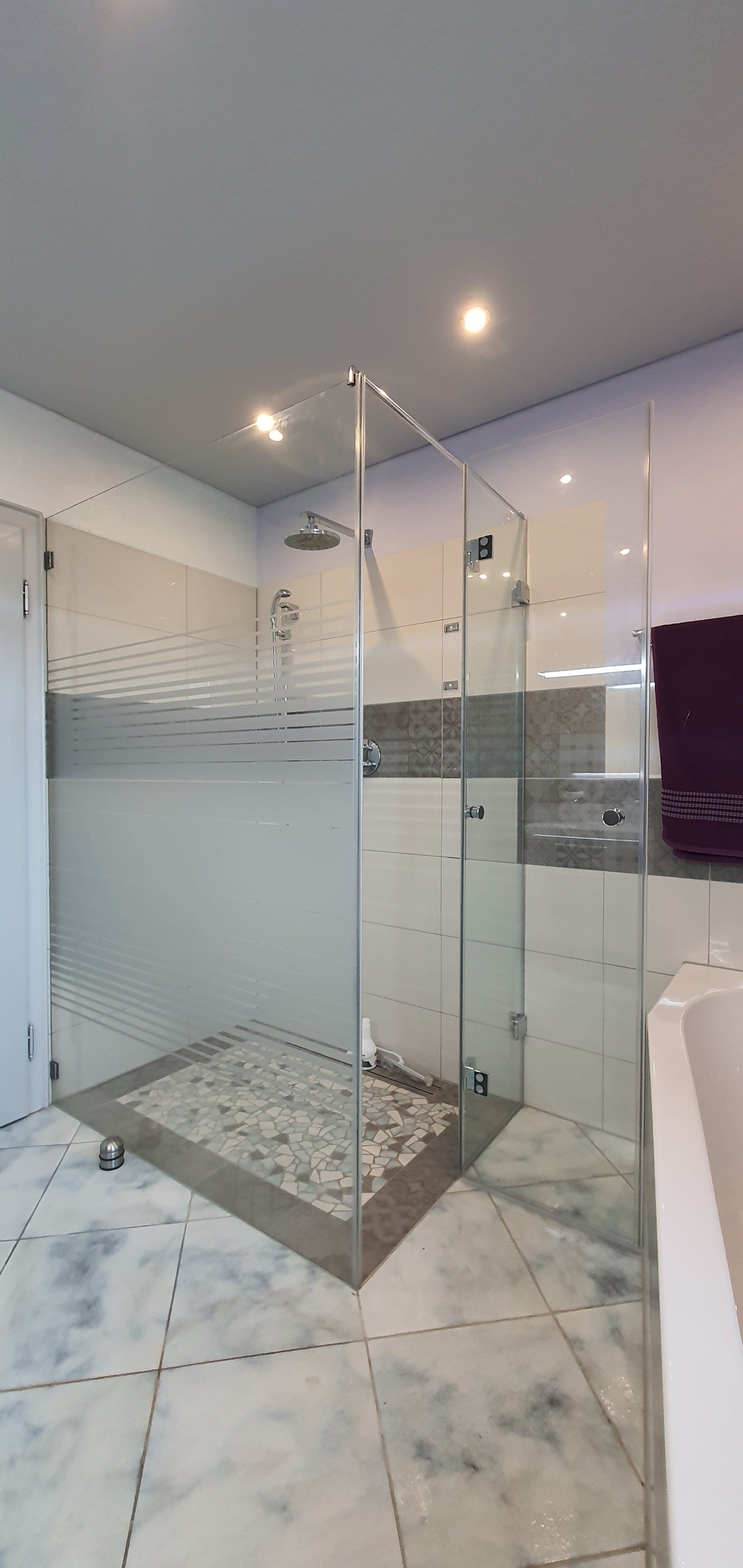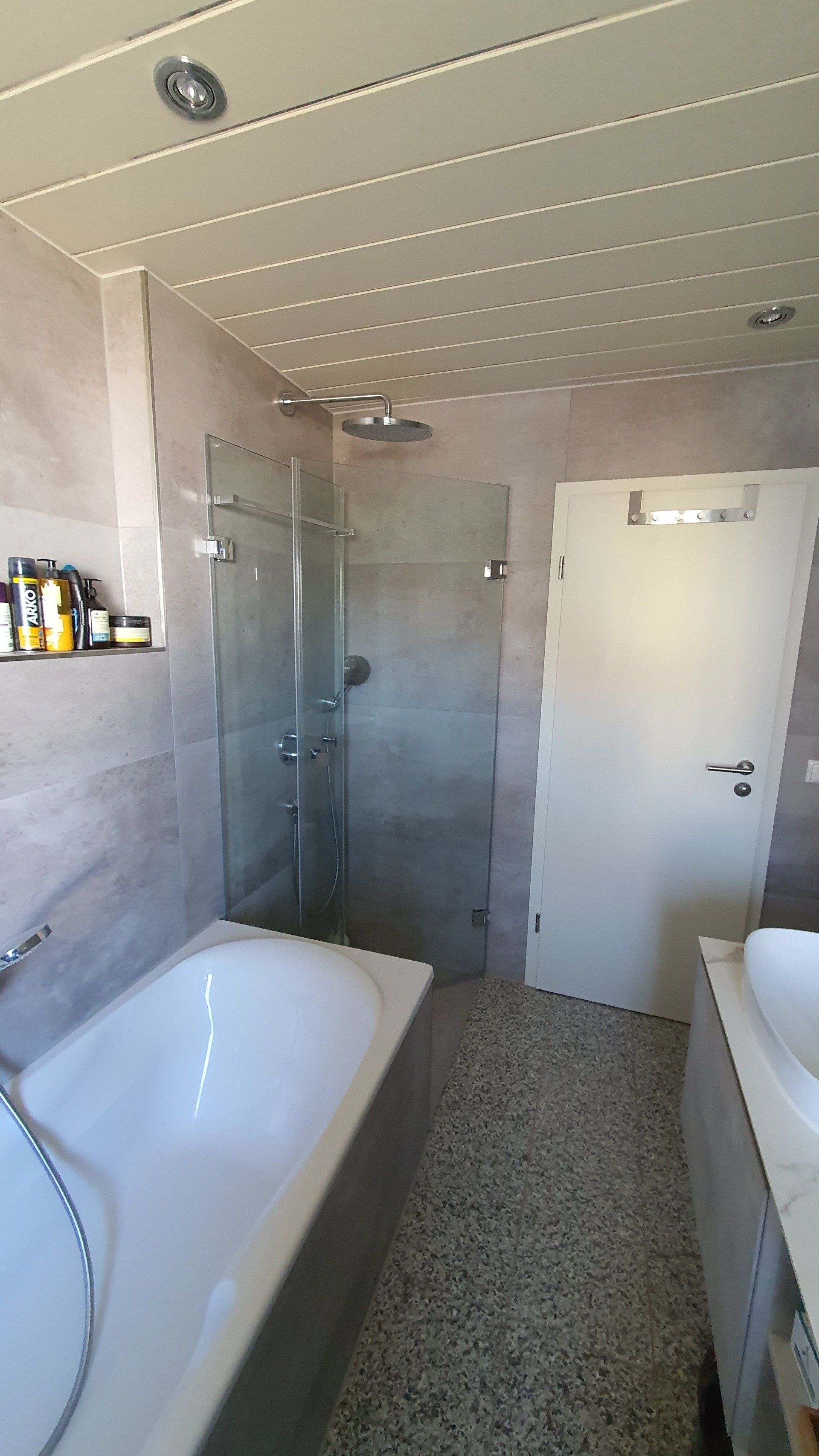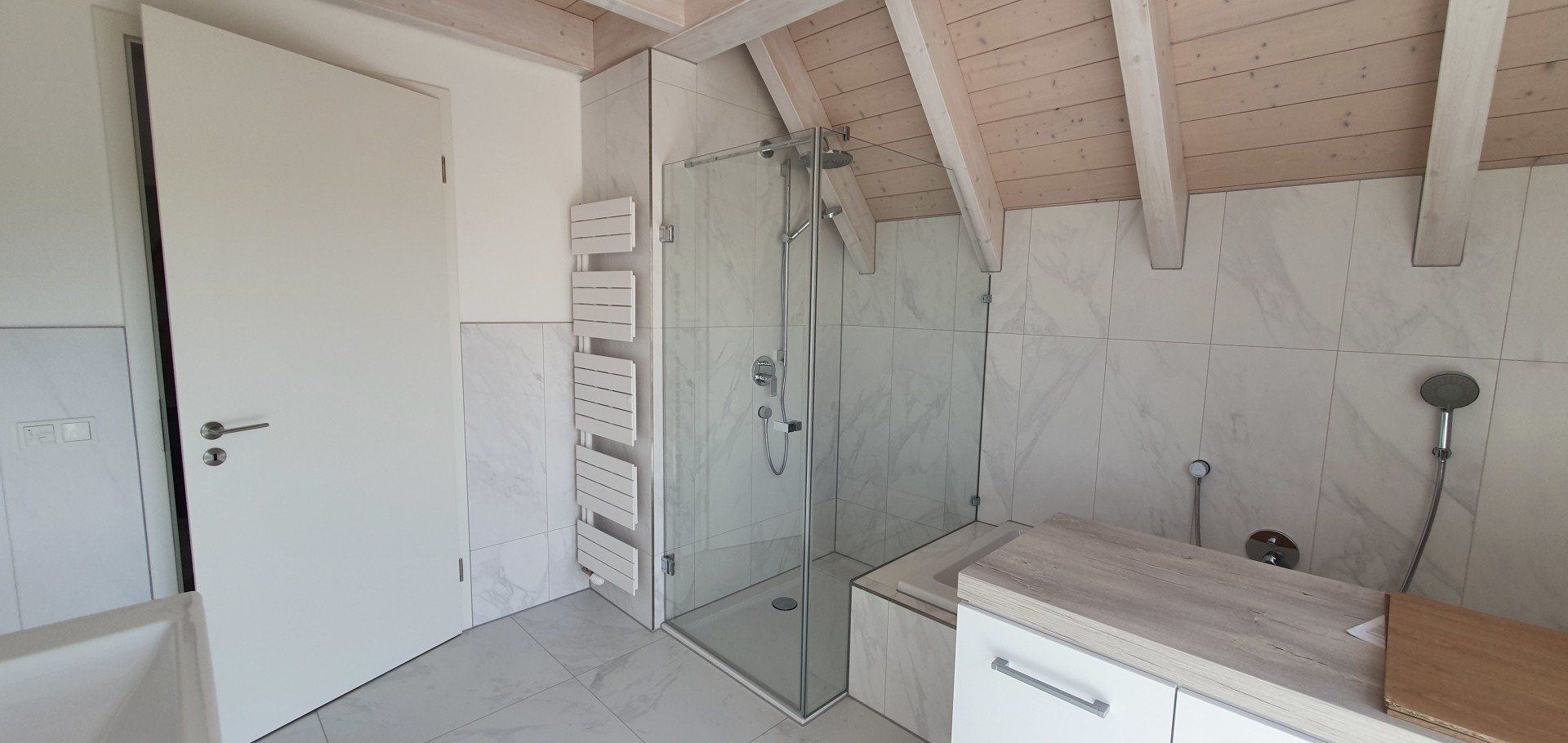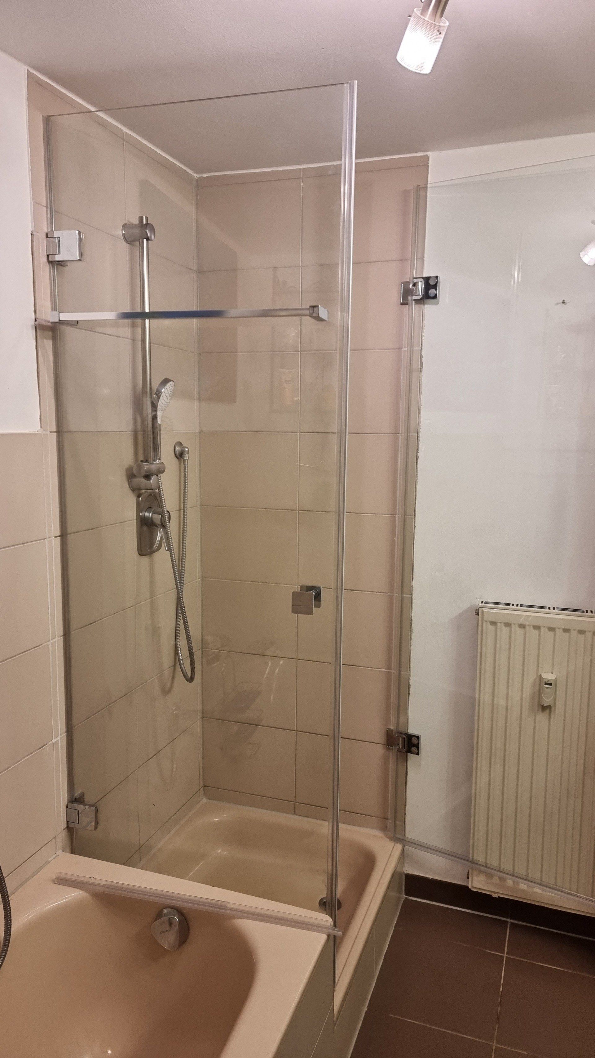 Ganzglasduschen ggf. mit Pendeltüren, die sich nach innen und nach außen öffnen lassen.